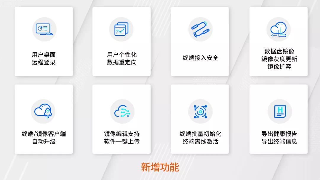 威讯云电脑V6.0在V5.1版本基础上升级,针对原有方案中以本地办公桌面为主,运维管理维度不足等升级,新增用户桌面远程登录、镜像灰度更新、镜像编辑支持软件一键上传等系列功能,在使用体验、管理运维、安全防护等维度上细化,全面满足用户实际的使用需求。
