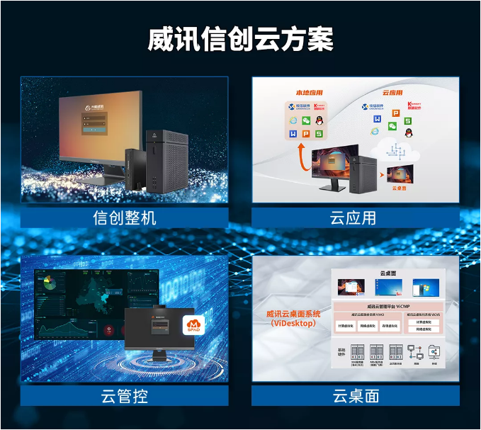 通过发布“云应用”,实现渐进式应用迁移,助力党政行业信创平滑替代。通过智能管控MSPAD系统,能够对多平台、多操作系统、多应用、多外设等全方位管控,解决异构环境下信息化建设问题。2020年9月信息技术应用创新产业发展峰会暨首届“鼎信杯”优秀信创产品征集活动中,威讯云电脑、云应用方案凭借绝对优势荣获“鼎信杯”信创优秀解决方案奖项。