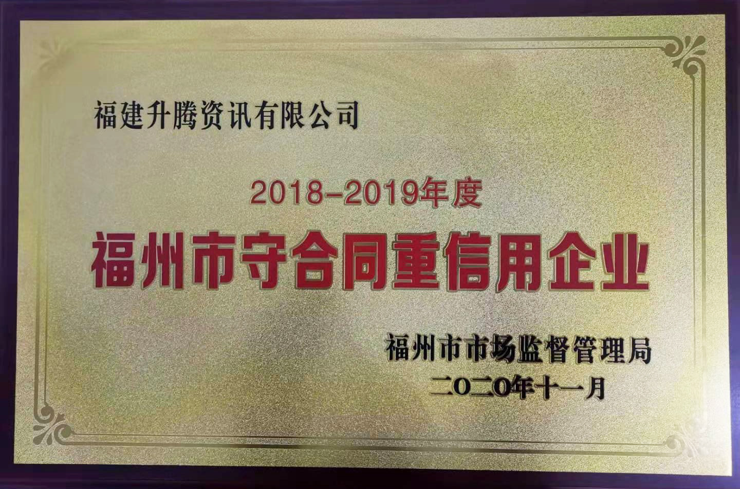 为贯彻落实习近平新时代中国特色社会主义思想和党的十九大精神,进一步推动我市企业信用体系建设,福州市市场监督管理局开展了“2018-2019年度福州市守合同重信用企业公示工作”。经过重重筛选及审定,升腾荣耀上榜,荣获“2018—2019年度福州市守合同重信用企业”称号。