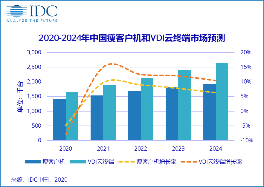 IDC回顾2020上半年并预测未来市场表现:伴随着政教、企业IT架构向私有云或公有云的迁移,桌面云终端市场将被持续看好,复合增长率将高于瘦客户机和商用PC市场。