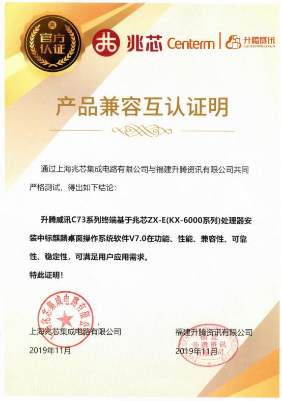 测试结果表明:升腾威讯C73系列终端基于兆芯ZX-C(C4701)、兆芯KX-6000系列安装中标麒麟桌面操作系统软件V7.0在功能、性能、兼容性、可靠性、稳定性可满足用户应用需求。