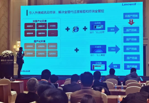 升腾桌面云事业部研发副总监&高级研究员 夏威作《建生态 赢未来》主旨演讲,围绕升腾国产化的发展历程分享,重点介绍升腾&鲲鹏国产化整体解决方案,阐述了如何与全行业最优秀的合作伙伴进行资源整合,以及通过云实现国产化弯道超车,形成超越PC的新一代信息技术产业。