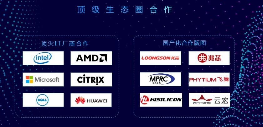 跟其他厂商不同的是,升腾威讯云始终坚持开放的合作态度,在产品和技术上,我们与国内外顶尖厂商,包括Intel、微软、DELL、华为上都保持着密切的合作。而最为最早开始在国产化发力储备的厂商,升腾威讯云长期与龙芯、兆芯、飞腾、云宏等国内优秀民族品牌保持深度合作,主动推进国产化技术产品化,发挥桌面云的优势,助力国产化进程,打造从终端到云端的整体全国产化桌面云方案。