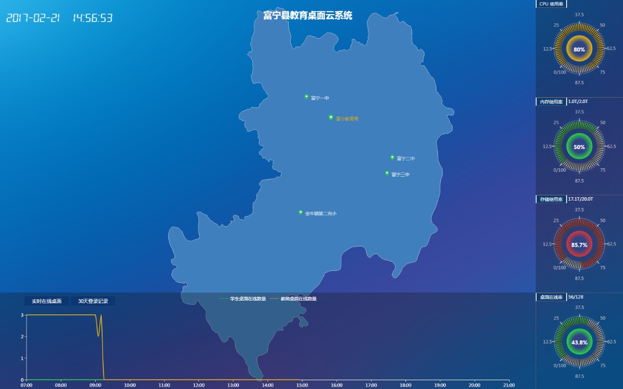 桌面应用分布在哪些学校、学校使用桌面情况、每天的桌面活跃、桌面服务器资源实时消耗情况等信息集中展示在监控平台,一目了然让资源可监控、可管理!