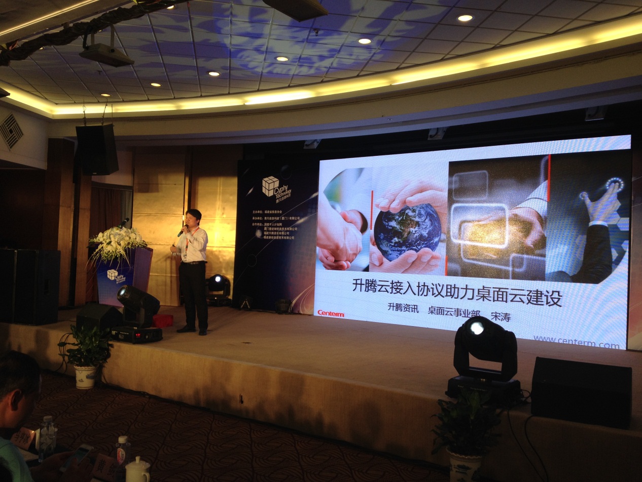 会议当天,来自省信息协会以及省内知名企业共一百余名嘉宾出席了会议。福建星网锐捷通讯股份有限公司副总裁,福建升腾资讯总裁郑宏先生也应约到场,并与现场的领导、嘉宾就当今大数据和云计算形势进行畅谈。此外,升腾资讯的产品经理宋涛在现场发表了精彩演讲,分别向到会嘉宾介绍了云计算下桌面云的优势和趋势,以及升腾自主云接入协议——Xred。